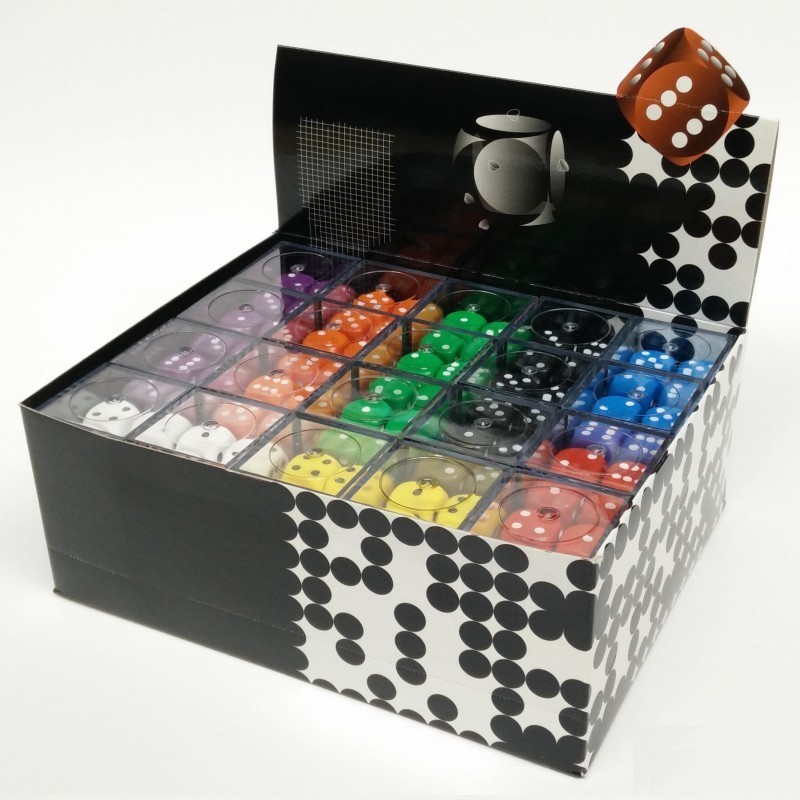 Brick contains 12 Dices with 6 Spots. Dimension 16MM. Transparent box.